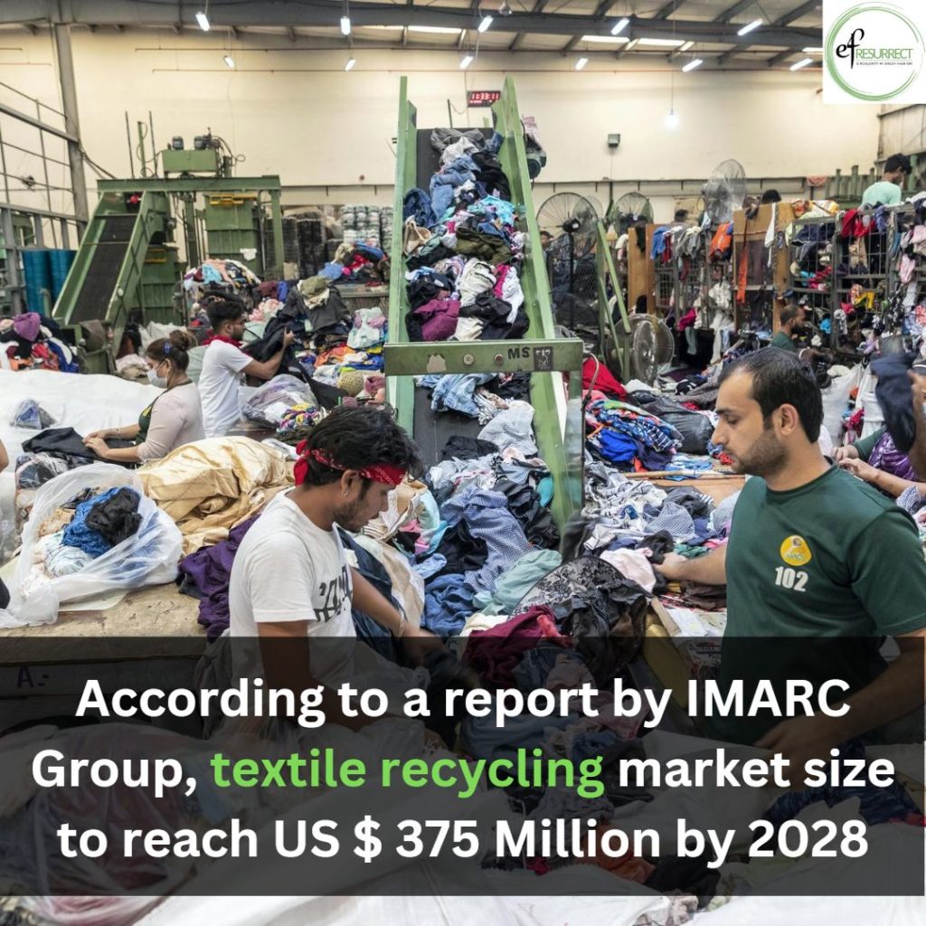 The textile recycling market in India reached a size of US $ 308.7 Million in 2022 and is expected to reach US $ 375 Million by 2028, showing a growth rate (CAGR) of 3.4 per cent during 2023-2028. Textile recycling is the method of reprocessing and reusing old clothing, fibrous waste materials, scraps, etc. It has numerous environmental and economic benefits, such as reducing levels of water and land pollution, curbing the use of chemical dyes, optimum consumption of energy, minimising dependence on virgin fibres and more. The key factors simulating the Indian textile recycling market include escalating demand for clothes with ecological integrity, the emerging trend of sustainable fashion and the increasing awareness of the consumer towards the detrimental effects on the environment of producing new apparel. Government policies and NGO programmes along with the rising amount of textile waste and improvements in recycling techniques are also boosting the recycling market.